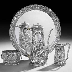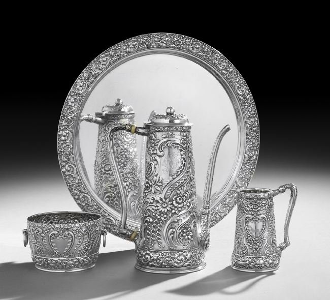 | Tiffany & Co. Four-Piece Sterling Silver Tete-a-Tete Coffee Set, 1892-1902, the pattern introduced in 1878-1879, New York, New York, including a tapering cylindrical coffeepot,  h. 7-1/2", and cream jug, h. 4", a bucket-form open sugar bowl, h. 2-1/2", and circular waiter, dia. 11",  decorated with repousse flowers and scrolls, the coffeepot monogrammed "SPS",  53.36 total t. oz.