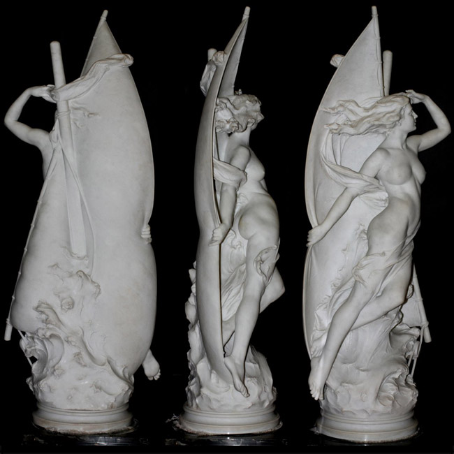 说明:Carved Carrara marble group of a nereid, or sea nymph, sensuously wrapped in the sail of a vessel.  Signed "Prof. V. Caradossi Firenze". On a black marble base.
